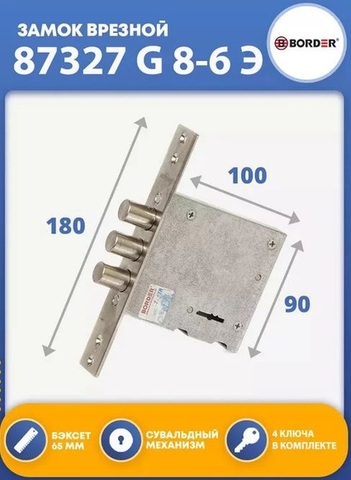 Верхний замок: Сувальдный замок Border G 8-6 Э с 3 ригелями диаметром 16 мм, 4 ключа 67(117) мм, 4-й (высший) класс.