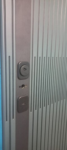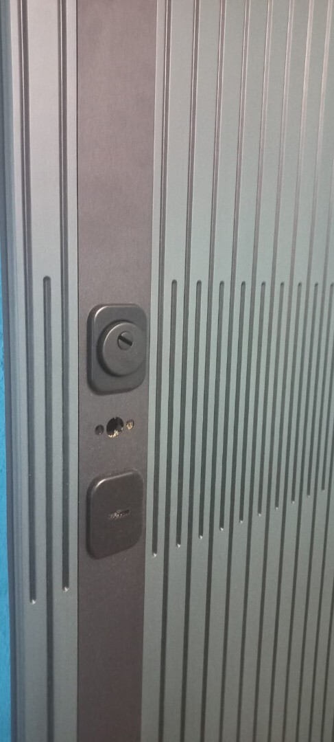 Фурнитура в черном цвете: Броненакладка врезная, накладка со шторкой, глазок , дверная ручка, ночная задвижка. Цилиндр ключ-вертушка Apecs, регулируемый эксцентрик.